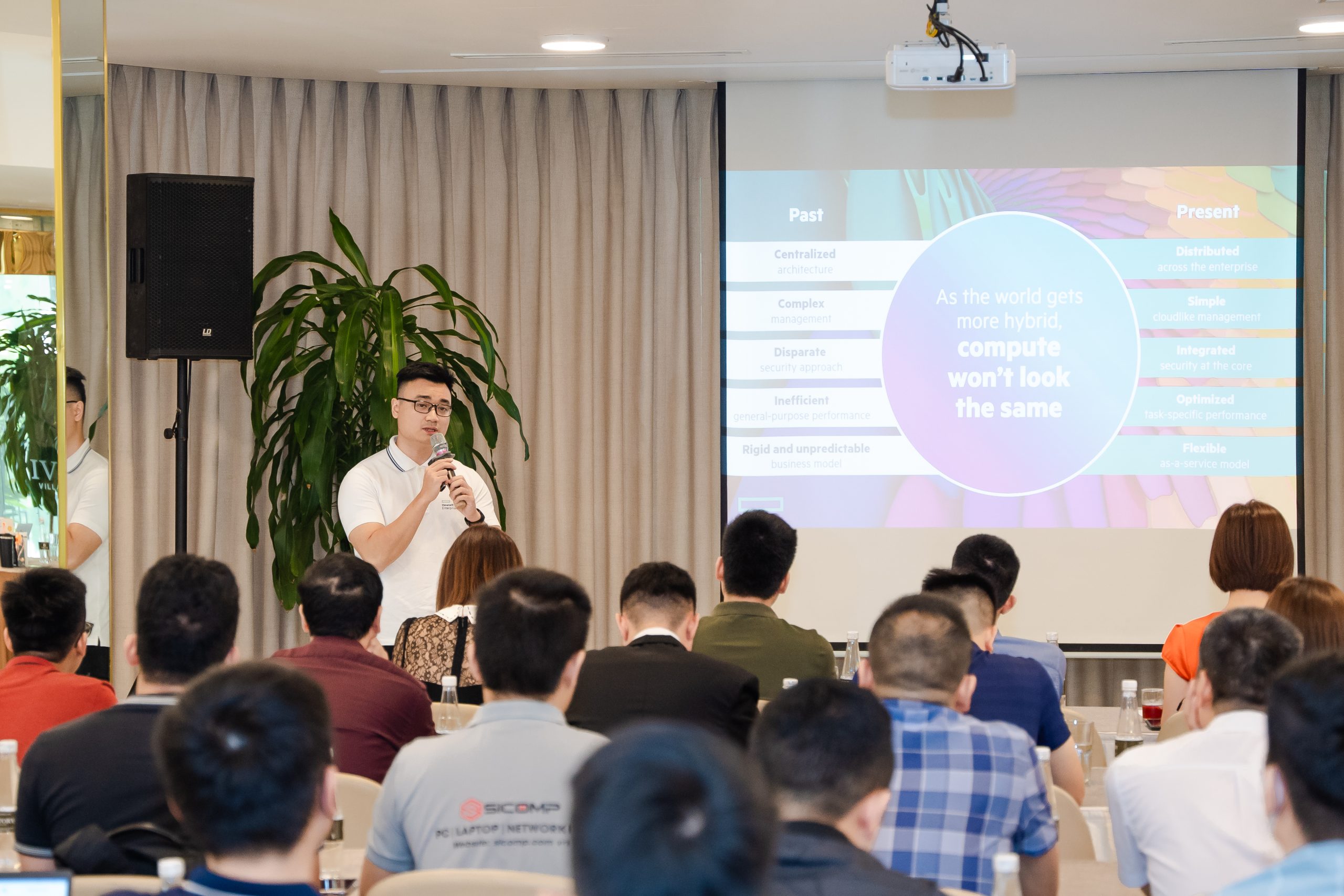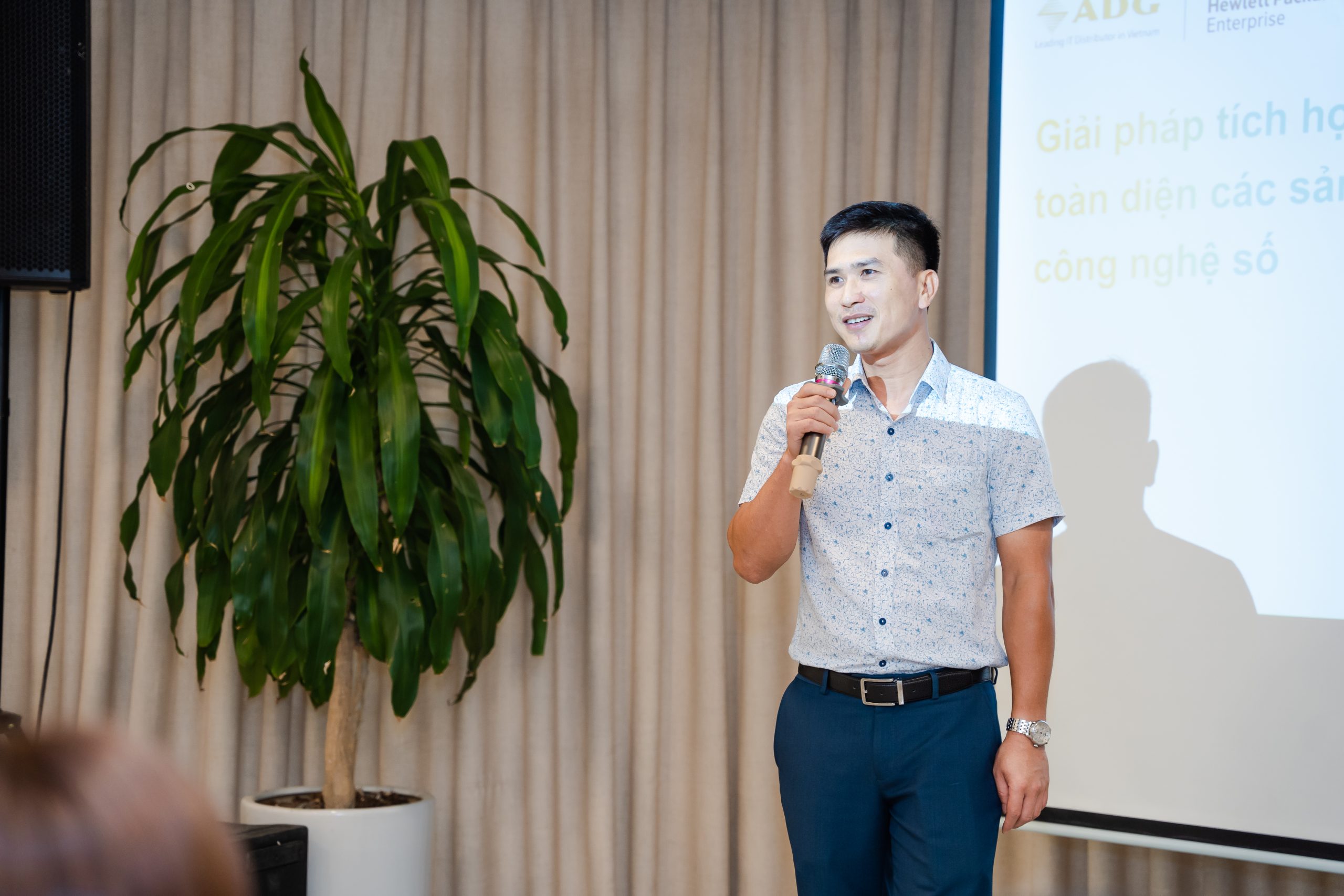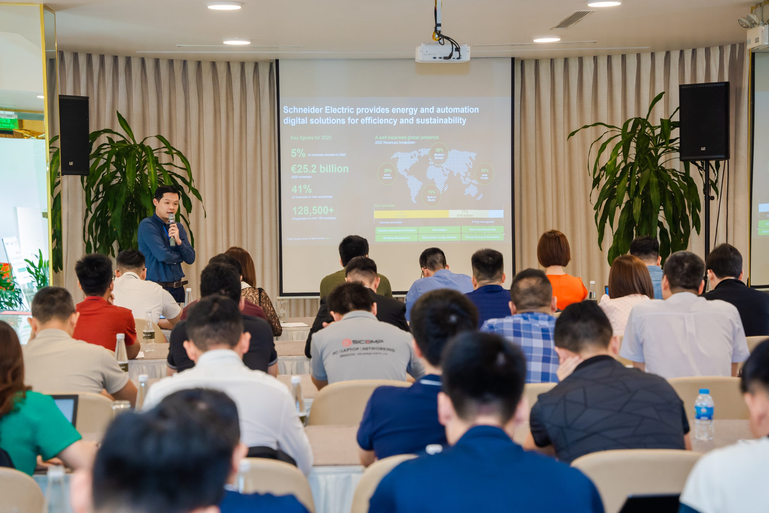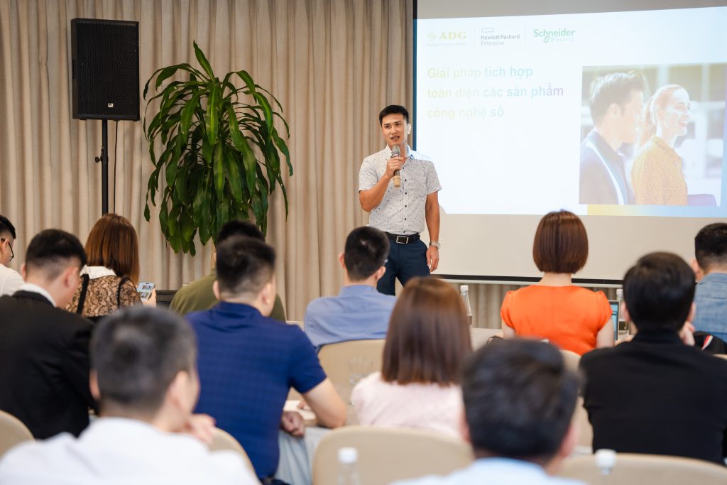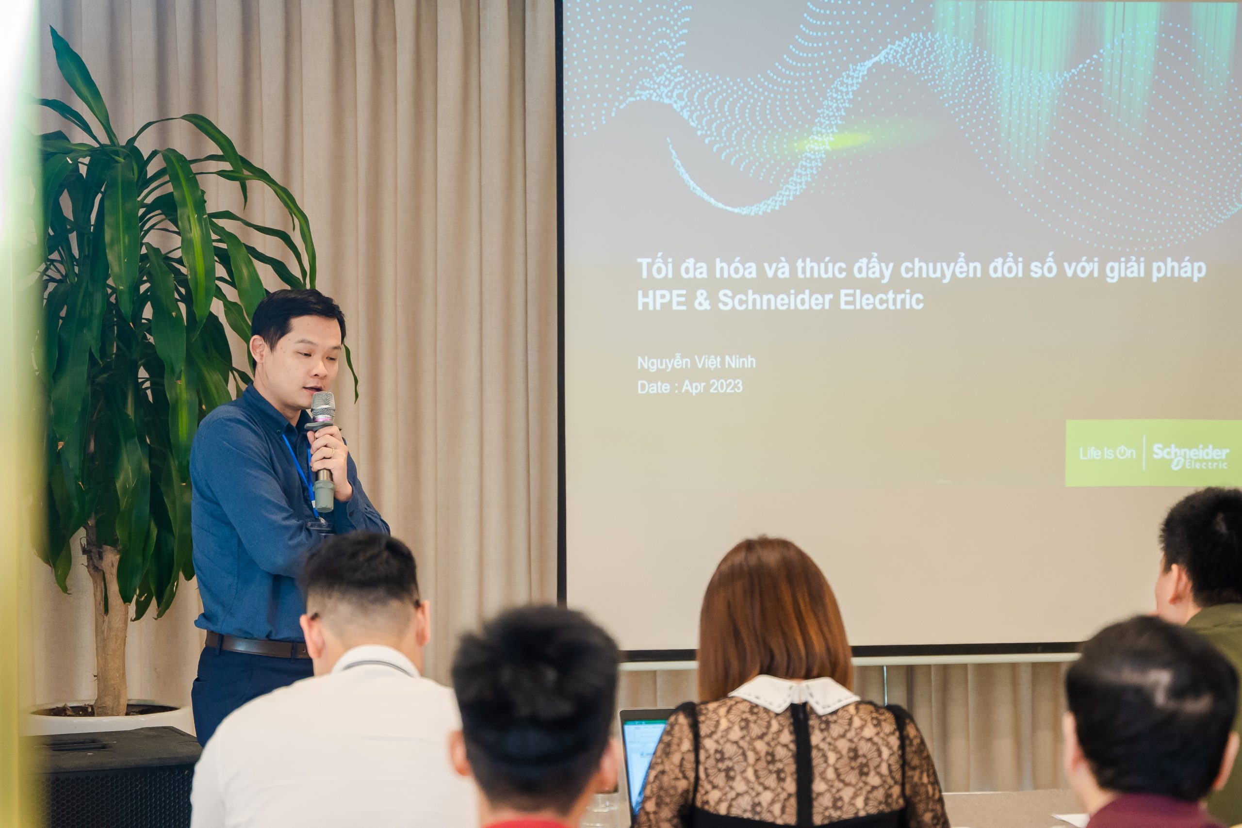 Tiếp nối các phần chia sẻ đến từ chuyên gia của HPE, phần tiếp theo của hội thảo với chia sẻ từ ông Nguyễn Việt Ninh – kỹ sư giải pháp đến từ Schneider Electric về chủ đề “Tối đa hóa và thúc đẩy chuyển đổi số cùng thiết bị lưu điện UPS Schneider”. Đại diện từ Schneider Electric đã giới thiệu đến các khách mời những sản phẩm và giải pháp mới nhất của Schneider Electric, đặc biệt là thiết bị lưu điện UPS Schneider – một sản phẩm được thiết kế để đảm bảo nguồn điện liên tục và ổn định cho các thiết bị điện tử và máy móc, đồng thời giúp bảo vệ chúng khỏi các vấn đề liên quan đến sự cố điện, cùng với đó là chủ đề về Edge Computing. Thông qua nội dung chia sẻ, khách mời đã hiểu rõ hơn về tính năng và lợi ích của thiết bị UPS Schneider trong việc tối đa hóa và thúc đẩy chuyển đổi số trong doanh nghiệp của mình.