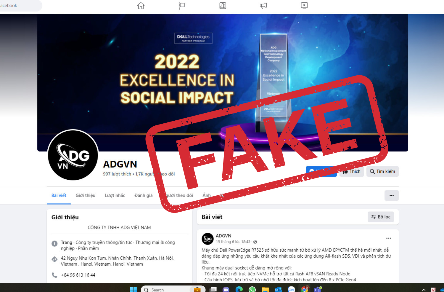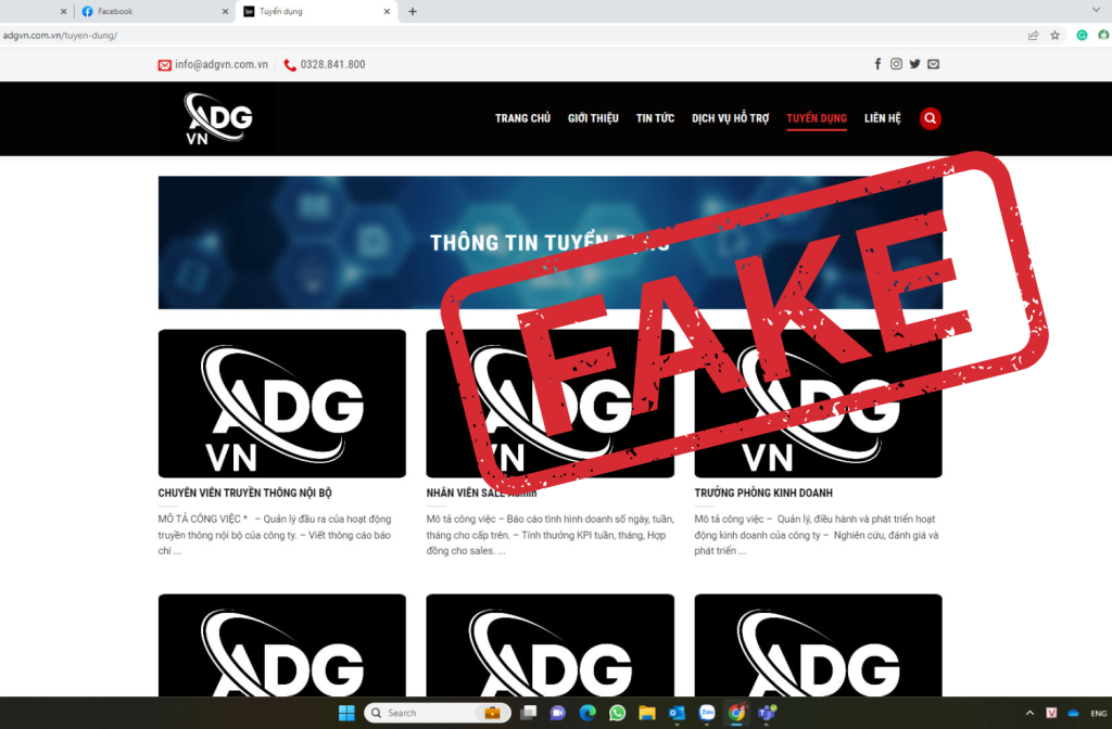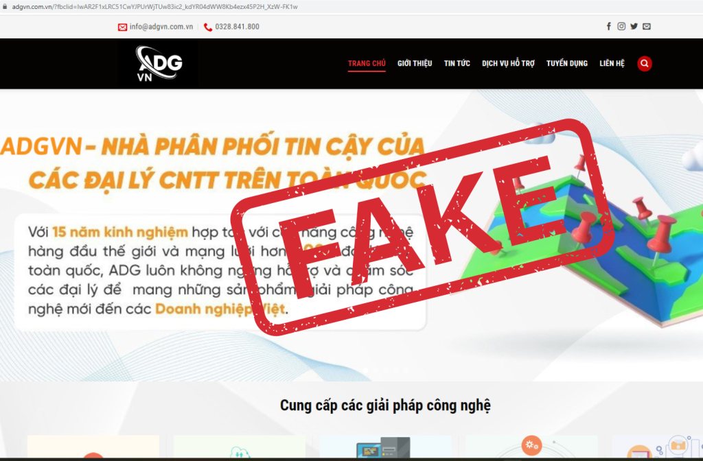 Với hình thức giả mạo tinh vi, chuyên nghiệp, các đối tượng này đã sử dụng bài đăng, hình ảnh của Công Ty Cổ phần Đầu Tư và Phát Triển Công Nghệ Quốc Gia ADG được đăng tải trên website chính thức của doanh nghiệp để giả mạo thành trang fanpage (FAKE): https://www.facebook.com/congtyadgvn và website (FAKE): https://adgvn.com.vn/ nhằm đánh lừa những khách hàng muốn tìm hiểu thông tin về Doanh nghiệp, cũng như các ứng viên đang tìm kiếm cơ hội việc làm.