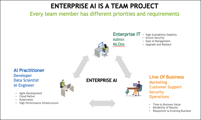 Để đảm bảo sự thành công của một dự án AI, đội ngũ phát triển (Developer, Data Scientist, AI Engineer), vận hành (IT Admin) và kinh doanh (Marketing, trung tâm dịch vụ khách hàng…) đều phải cần vào cuộc, và duy trì một quy trình tương tác, phản hồi nhanh chóng, hiệu quả giữa các bộ phận. Đồng thời, công cụ vận hành hạ tầng cũng như khai thác dữ liệu cần tối ưu hóa để giải phóng sức mạnh, hiệu năng.