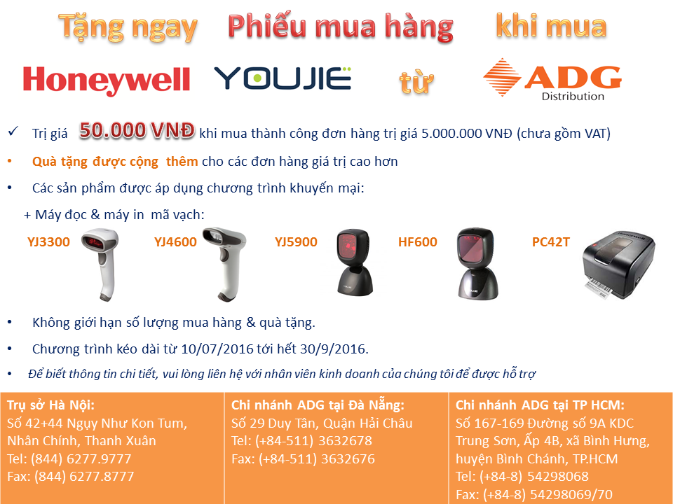 Từ ngày 10/7/2016 tới hết ngày 30/9/2016, khách hàng load thiết bị Honeywell Youjie từ ADG sẽ nhận ngay phiếu mua hàng trị giá 50.000 VNĐ trở lên.