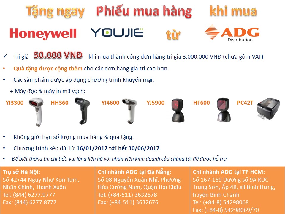 Tiếp nối chương trình khuyến mại “Thoải mái mua sắm, không lo tốn tiền”, chúng tôi tiếp tục dành tặng khách hàng phiếu mua hàng siêu thị trị giá 50.000 VNĐ trở lên khi mua các sản phẩm Honeywell & Youjie từ ngày 16/1/2017 tới hết 30/6/2017 trong chương trình “Thỏa sức mua sắm cùng Honeywell & ADG”.
