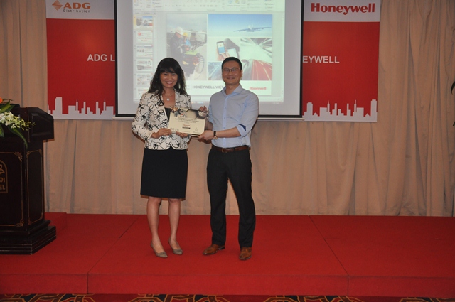 Bà Mai Trang Thanh (Chỉ tịch Honeywell khu vực Đông Dương) trao chứng nhận là nhà Phân phối các sản phẩm Honeywell và Youjie cho Ông Đặng Vũ Toàn (Giám đốc Công ty ADG)