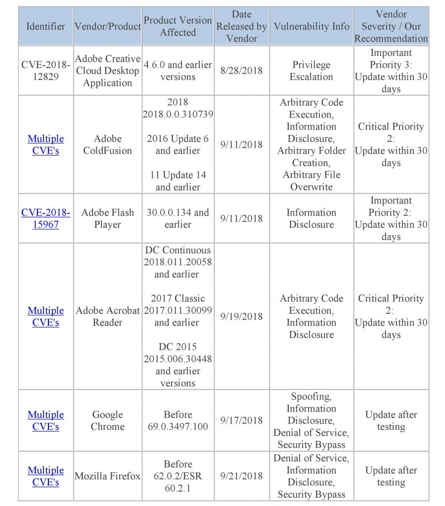 Trong tháng 9, có hai bản sửa lỗi cho phần mềm Adobe bao gồm Creative Cloud Desktop Application và Acrobat Reader. Phần mềm Adobe Acrobat Reader được cài đặt trên rất nhiều máy tính vì tính dễ sử dụng không thu phí. Vì vậy, người dùng cần cập nhật thường xuyên các bản vá bảo mật liên quan tới Acrobat Reader. Với ColdFusion, có rất nhiều lỗ hổng nghiêm trọng được khắc phục với các bản cập nhật này. Chúng tôi rất khuyên mọi người nên chạy ColdFusion xem lại Adobe lockdown guides để áp dụng các cấu hình an toàn. Cuối cùng, áp dụng các bản cập nhật cho ứng dụng Creative Cloud Desktop.