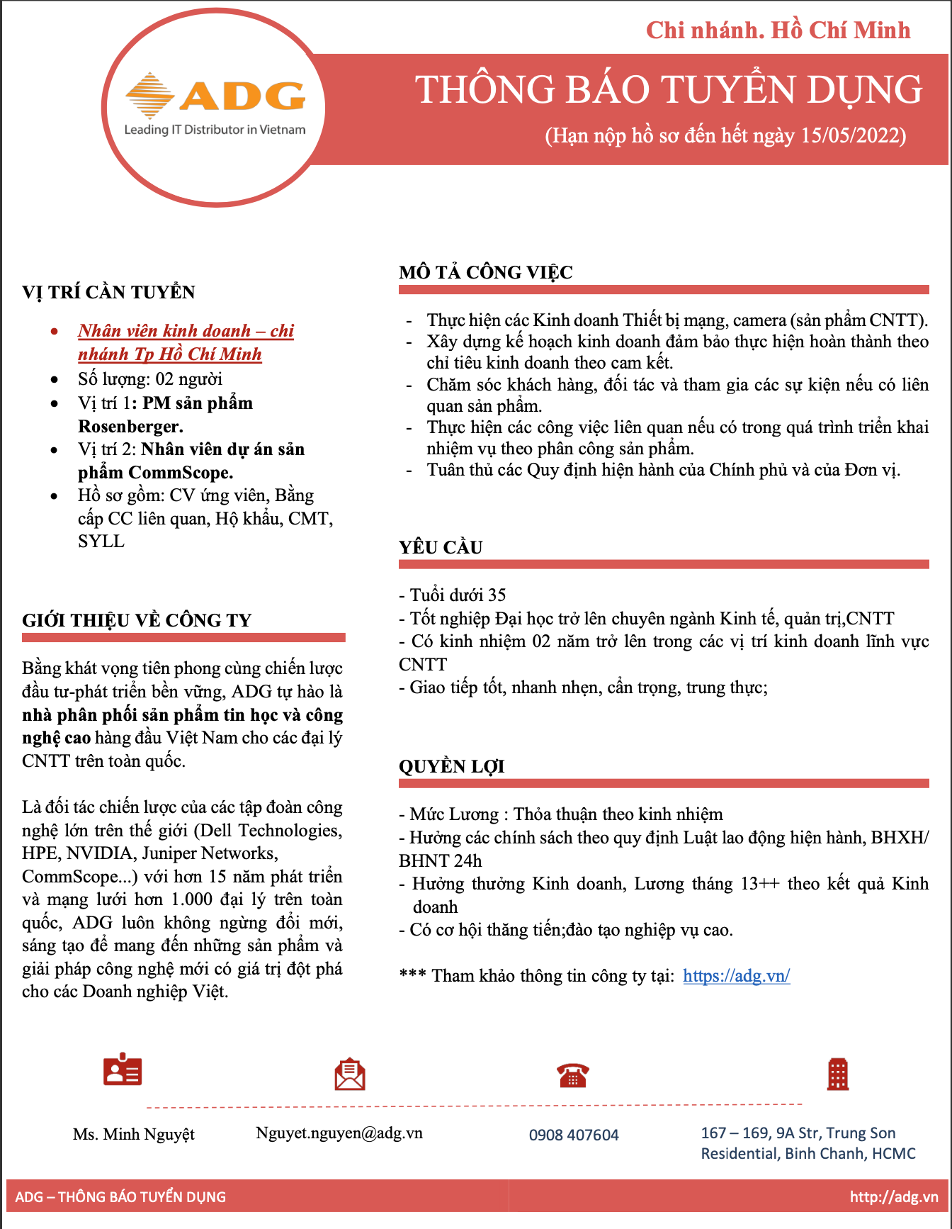 Công Ty Cổ phần Đầu Tư và Phát Triển Công Nghệ Quốc Gia ADG (ADG National Investment and Technology Development Corporation) tuyển dụng vị trí Nhân viên kinh doanh – chi nhánh Hồ Chí Minh.