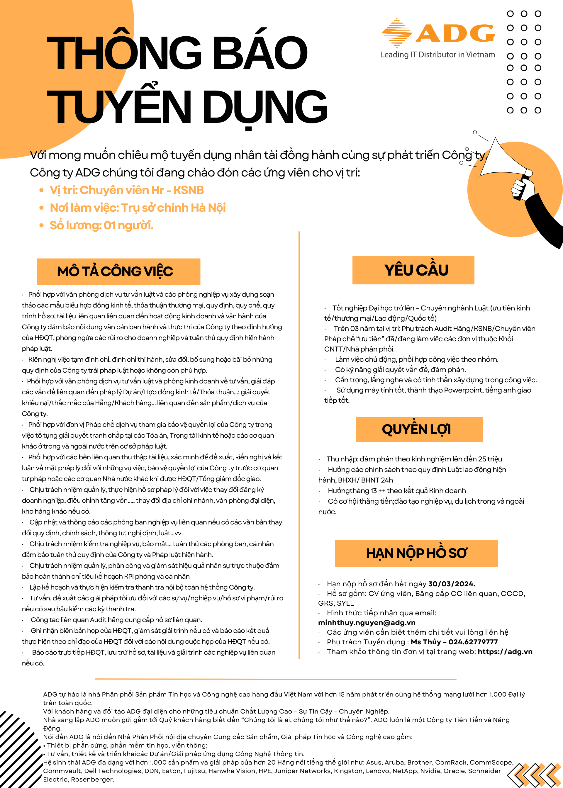 Thông báo tuyển dụng T3/2024: Chuyên viên Hr – KSNB