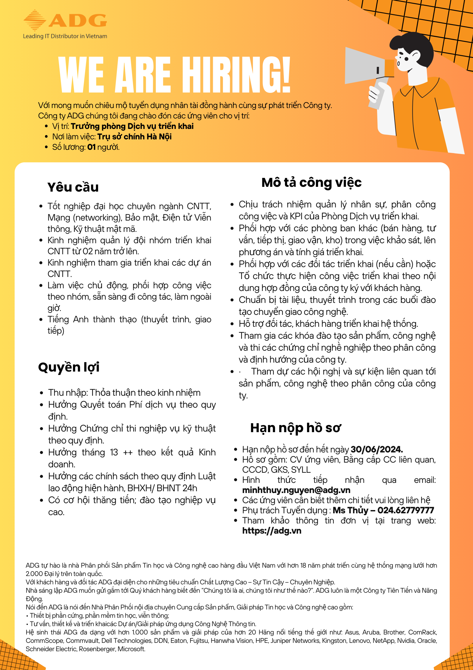 THÔNG BÁO TUYỂN DỤNG THÁNG 5: Trưởng phòng Dịch vụ triển khai